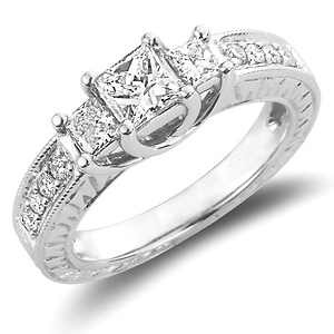 This princess cut engagement ring is a truly remarkable 14K white gold ring. Its milgrain edge has an intricate, unique carved design along the side view, giving a vintage feel, with pave set round cut diamonds along the band. The center three-stone princess cut diamonds sit in a prong setting while shining brightly. A gorgeous ring.