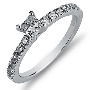 This nouveau style engagement ring exudes true beauty. With side diamonds sparkling brightly halfway along the 14K white gold band on both sides, the four prong set princess cut diamond gleams even more in the center of the ring. A sparkling, excellent choice.